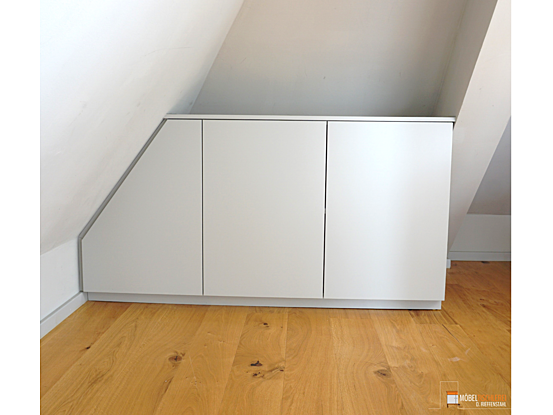 Dieses maßgefertigte Sideboard ist die perfekte Lösung für eine Nische mit zwei Dachschrägen. Das stilvolle Design fügt sich harmonisch ein und schafft gleichzeitig praktischen Stauraum für Bücher, Dokumente und andere persönliche Gegenstände - ideal für ein aufgeräumtes und modernes Wohnambiente.