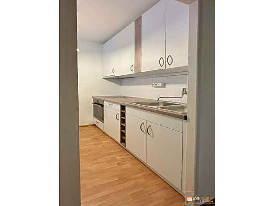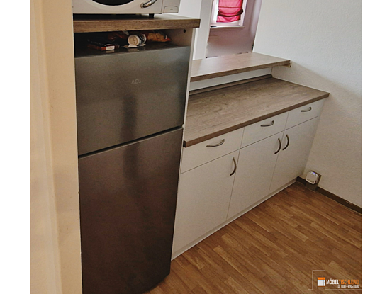 Diese schlichte Küchenzeile in Weiß, kombiniert mit grauem Eiche-Dekor, bietet eine zeitlose Möbellösung. Das funktionale Design und die hochwertige Verarbeitung machen diese Küche zu einem stilvollen Highlight.