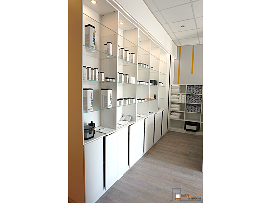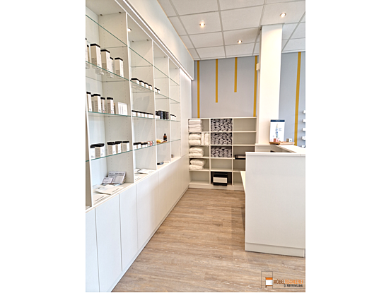 Der Empfangsbereich eines Spas sorgt dafür, dass Gäste sofort den stressigen Alltag hinter sich lassen können. Ein einladender Empfangstresen heißt Besucher herzlich willkommen, während ein großes Wandregal mit integrierten LED-Spots die verwendeten Produkte stilvoll in Szene setzt. Ein weiteres Regal bietet praktischen Stauraum und dient als Handtuchlager. Eintreten und wohlfühlen – der perfekte Start für Ihr Spa-Erlebnis.