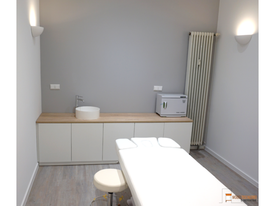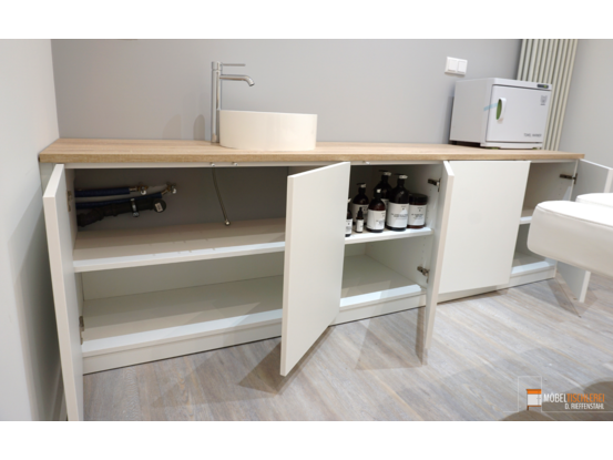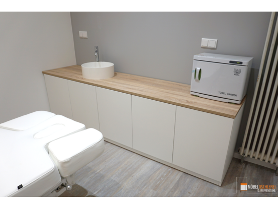 In den Massageräumen eines Spas sorgen individuell gestaltete Sideboards in Weiß und Sonoma-Eiche für eine beruhigende Atmosphäre. Diese hochwertigen Maßmöbel bieten nicht nur praktischen Stauraum für Utensilien, sondern unterstreichen die stilvolle und funktionale Raumgestaltung. Sie sind eine perfekte Möbellösung, die Ruhe und Gemütlichkeit ausstrahlt und das Spa-Erlebnis auf elegante Weise vervollständigt.