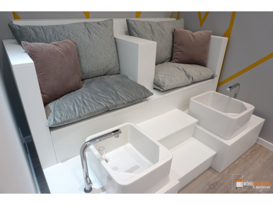 Einfach zurücklehnen und sich von erfahrenen Pediküre-Expert*innen verwöhnen lassen – dafür haben wir eine maßgefertigte Pedikürebank für ein Spa konzipiert. Der Pediküre-Thron ist groß genug für zwei Personen und ermöglicht eine entspannende Fußpflege zu zweit. Mit der eingebauten Treppe lässt sich der Thron bequem besteigen und sorgt für eine komfortable und funktionale Möbellösung. So wird jedes Pediküre-Erlebnis zu einem stilvollen Wohlfühlprogramm.