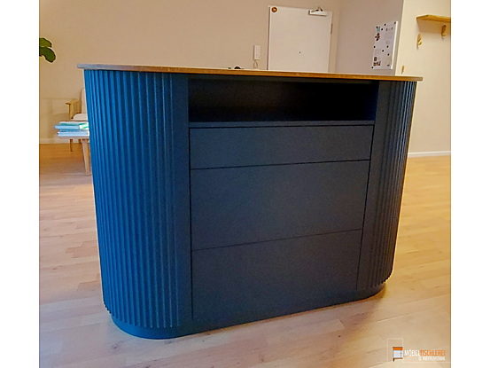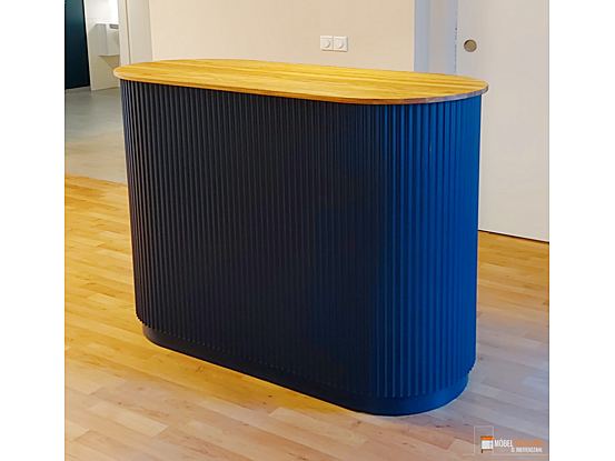 Dieser ovale Empfangstresen ist ein echter Hingucker im Eingangsbereich. Mit einer gebogenen Hohlkehlenplatte in edlem Dunkelblau und einer naturgeölten Eichenplatte oben sorgt er für einen stilvollen Empfang. Ideal, um Besucher herzlich willkommen zu heißen und einen bleibenden Eindruck zu hinterlassen.