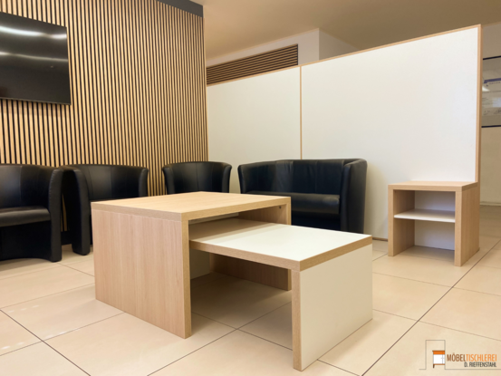 In dieser Arztpraxis sorgen Akustikpaneele aus Eiche für schallabsorbierende Trennung zwischen Wartebereich und Empfangsbereich. Sie bieten nicht nur Diskretion, sondern auch ein gemütliches Ambiente. Der harmonische Kontrast zwischen der weißen Trennwand und den Paneelen wird durch einen stilvollen Beistelltisch und Ablagetisch abgerundet – eine funktionale und stilvolle Möbellösung für den Wartebereich.