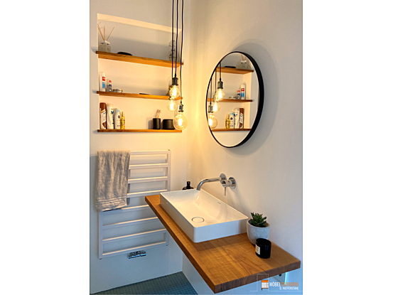 Dieser Waschtisch aus europäischer Kirsche kombiniert minimalistisches Design mit natürlicher Holzwärme. Er ist aus einem Stück gefertigt und wird durch unsichtbar befestigte Regalböden perfekt ergänzt. Gratleisten sorgen dafür, dass das Holz stabil bleibt, während die Ölbehandlung dem Waschtisch eine lange Lebensdauer verleiht.