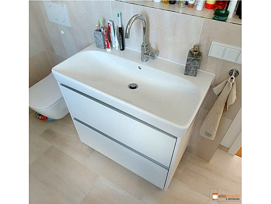 Dieser Unterschrank ist perfekt an die Größe des Waschbeckens angepasst. Die zwei Schubkästen mit dezenten Alu-Griffleisten (wahlweise mit Innenunterteilung) bieten praktischenStauraum für kleine Badutensilien.