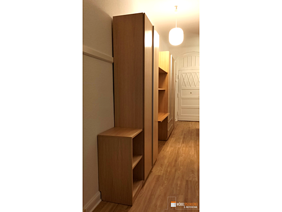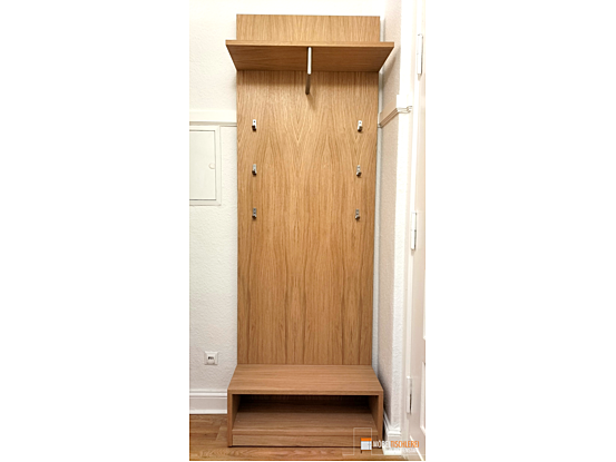Diese Flurmöbel aus furnierter, naturgeölter Eiche bieten eine perfekte Kombination aus Ablagefläche und Stauraum. Die offenen und geschlossenen Elemente sorgen für eine vielseitige Nutzung. Türhohe Griffleisten, Haken und eine Kleiderstange aus Edelstahl setzen stilvolle Akzente und ergänzen das elegante Design. Die natürliche Holzoptik harmoniert wunderbar mit dem Boden und schafft eine warme und einladende Atmosphäre im Flur.