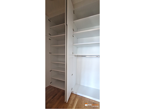 Dieser deckenhohe Flurschrank in Weiß kombiniert offene und geschlossene Elemente und bietet großzügigen Stauraum. Integrierte Garderobenstangen sorgen für eine praktische Aufbewahrung von Jacken und Mänteln. So entsteht eine aufgeräumte und stilvolle Lösung für den Eingangsbereich.