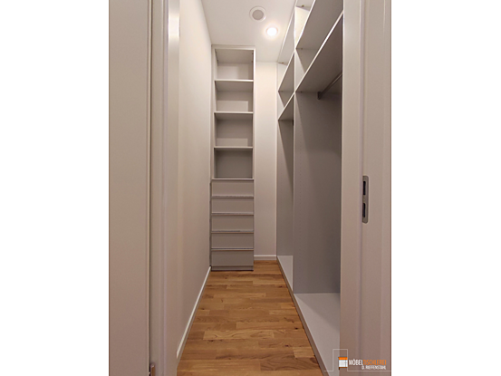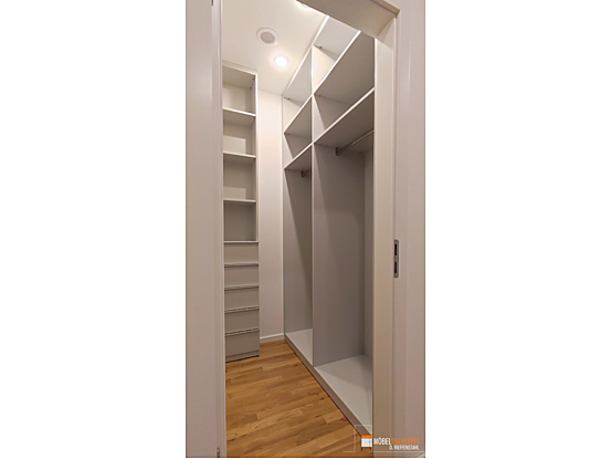 Diese deckenhohe Garderobe in Lichtgrau fügt sich perfekt in diesen kleinen Raum ein und bietet großzügigen Stauraum für Jacken, Mäntel und Accessoires. Das zeitlose Design sorgt für eine ruhige und geordnete Atmosphäre.
