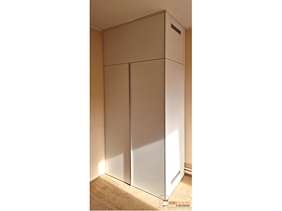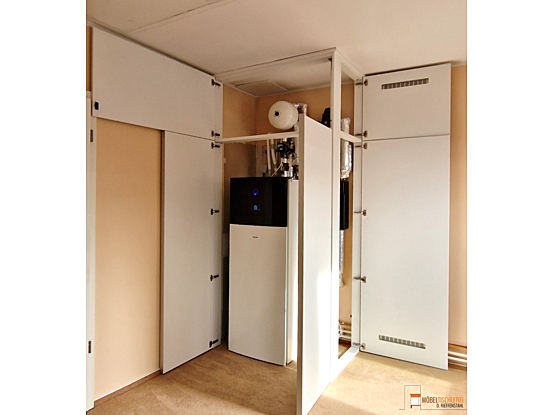 Diese weiße Heizungsverkleidung verdeckt geschickt die Hausinstallation und sorgt mit einem Lüftungsgitter im oberen Bereich für optimale Luftzirkulation. Die geschlossenen Türen und die beidseitige Zugänglichkeit bieten praktische Vorteile und fügen sich perfekt in das Raumdesign ein.