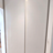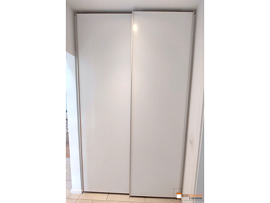 Dieser maßgeschneiderte Nischenschrank im Eingangsbereich überzeugt durch schlichte Eleganz. Die aluminiumfarbenen, schrankhohen Griffleisten setzen einen modernen Akzent. Beim Öffnen der Schiebetüren entfaltet sich eine geräumige Garderobe mit viel Stauraum für Schuhe, Jacken, Helme und mehr.