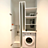 Dieser Schrank fügt sich nahtlos in eine Flurnische ein und besticht durch seine asymmetrischen Fräsungen auf den weiß lackierten Türen. Beim Öffnen zeigt sich ein wahres Multifunktionstalent: Neben Platz für eine Waschmaschine und Zubehör bieten die Schubkästen zugleich eine praktische Treppe, um an Deckeninstallationen zu gelangen. Zusätzliche Schrankeinbauten sorgen für noch mehr Stauraum.