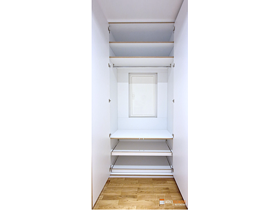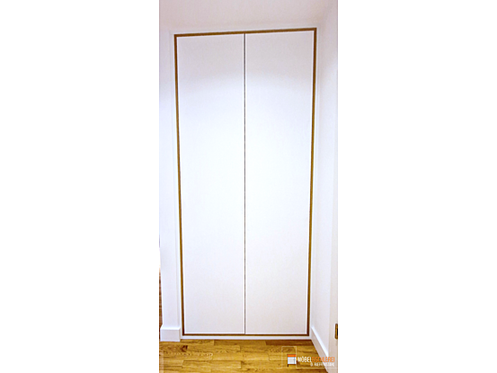 Dieser Flurschrank in Weiß nutzt die verfügbare Nische perfekt aus und setzt mit der Multiplexkante einen stilvollen Farbtupfer.