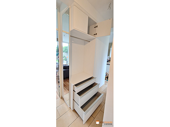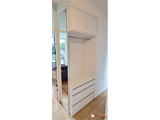 Diese minimalistische Garderobe in Weiß überzeugt mit durchdachtem Design. Sie bietet Platz für Jacken und Schuhe, während zusätzlicher Stauraum hinter den Türen und in den Schubkästen Platz für Accessoires und Schals schafft. Der seitlich angebrachte Spiegel ermöglicht einen schnellen Blick auf das Outfit, bevor man das Haus verlässt.