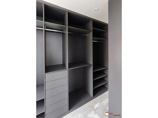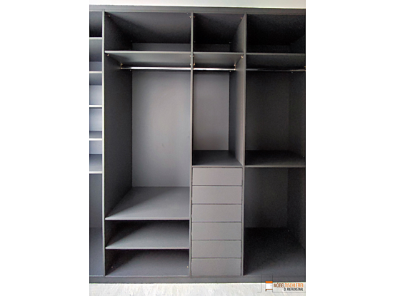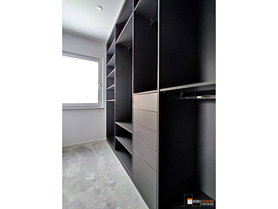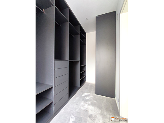 Dieses geräumige Ankleidezimmer in stilvollem Anthrazit bietet ausreichend Platz für Ihre gesamte Garderobe. Mit cleveren Ablageflächen und Staumöglichkeiten findet jedes Kleidungsstück seinen perfekten Platz.