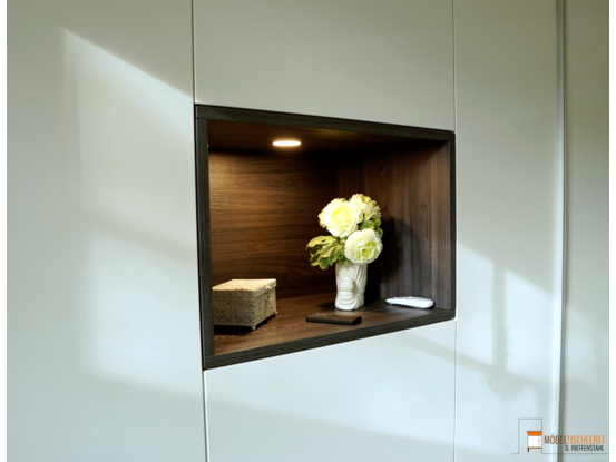 Der Kleiderschrank besticht durch ein mittig eingebautes, offenes Regal in Ulme Onyx, das Dekorationen perfekt in Szene setzt. Die türhohen Alugriffleisten runden das Design ab. Im Inneren bieten Schubkästen und flexibel anpassbare Einlegeböden vielseitigen Stauraum.
