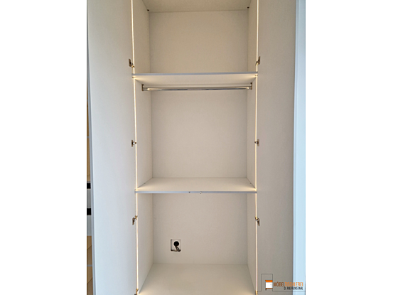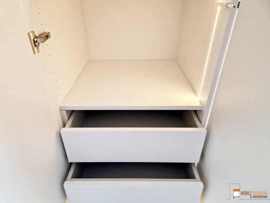 Dieser Kleiderschrank bietet eine praktische Lösung für die übersichtliche Aufbewahrung von Kleidung. Mit Kleiderstangen für Jacken und Hemden, Schubkästen für Socken und Unterwäsche sowie flexibel einlegbaren Böden für Hosen und Pullover bietet der Schrank ausreichend Stauraum. Beim Öffnen entsteht durch die integrierte LED-Beleuchtung ein gemütliches und einladendes Ambiente im Zimmer.