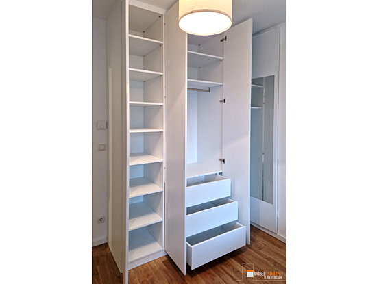 Dieser deckenhohe Kleiderschrank überzeugt durch schlichte Eleganz und bietet mit seiner praktischen Innenaufteilung viel Platz für die Garderobe. Die Kombination aus Kleiderstangen, Schubkästen und Einlegeböden sorgt für optimale Ordnung und Struktur. Die innenliegenden Spiegel gewährleisten ein klares, ungestörtes Bild von außen und runden das Design perfekt ab.