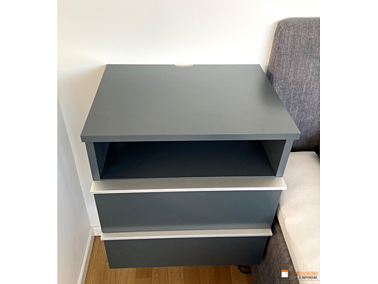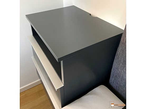 Dieser anthrazitfarbene, schwebende Nachttisch sorgt nicht nur für ein edles Design im Schlafzimmer, sondern erleichtert auch das Staubsaugen. Die schubkastenbreiten Edelstahl-Griffleisten setzen einen modernen Akzent und unterstreichen das stilvolle Gesamtbild.