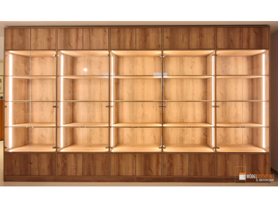 Dieses Regal in hochwertigem Eiche-Dekor besticht durch eine große, beleuchtete Vitrine, ideal zur Präsentation der Lieblingsstücke. Zusätzlicher Stauraum wird durch geschlossene Elemente geboten, die das Regal sowohl funktional als auch stilvoll abrunden.