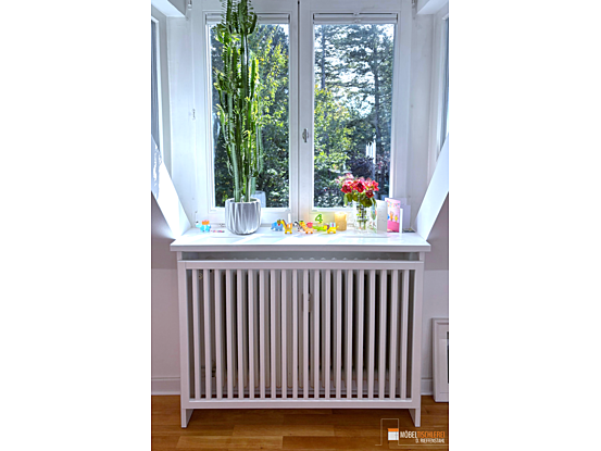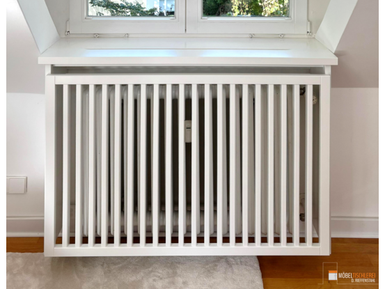 Diese Heizungsverkleidung aus weiß lackiertem Massivholz bringt nicht nur ein harmonisches Gesamtbild in den Raum, sondern kaschiert unauffällig die Heizkörper. Das dezente Design fügt sich nahtlos in die Einrichtung ein und sorgt für eine stilvolle Optik.