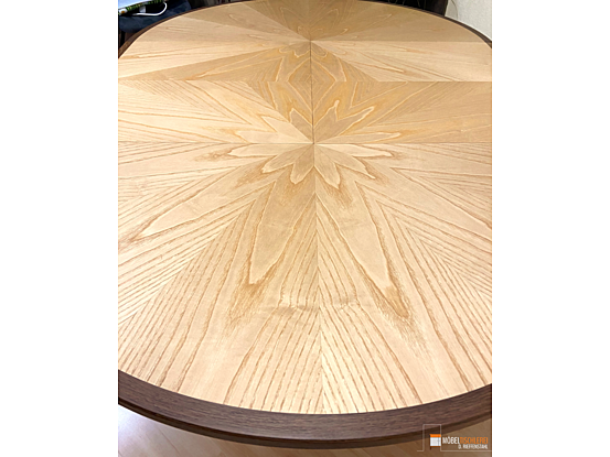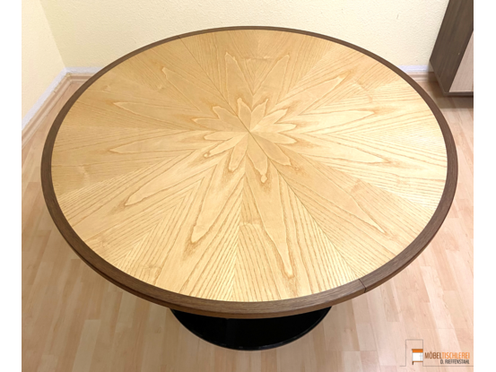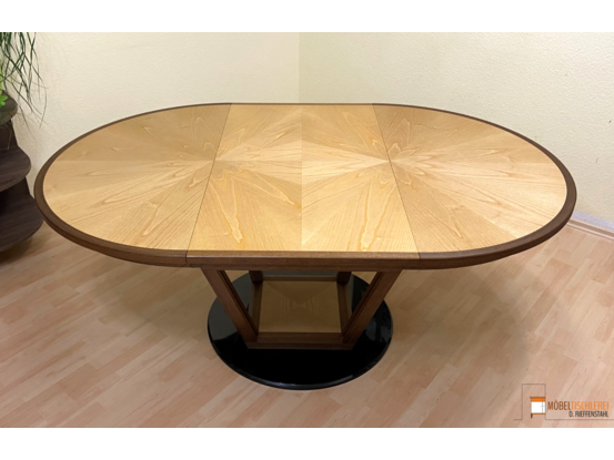 Der RoomStar Esstisch ist sowohl funktional als auch ein wahrer Blickfang in jedem Essbereich. Mit seinem eleganten Sternfurnier aus Esche und dem geräucherten Eichenrahmen schafft der Tisch eine stilvolle Atmosphäre. Die runde Form fördert eine angenehme Kommunikation, da bis zu sechs Personen direkten Blickkontakt haben können. Dank des integrierten Mittelstücks lässt sich der Tisch für bis zu zehn Personen erweitern, die angenehm an einer ovalen Tafel Platz nehmen können – perfekt für Familienessen oder gesellige Spieleabende.
