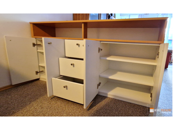 Dieses nahezu freistehende Sideboard dient als eleganter Raumteiler, der dezent den Wohn- vom Essbereich trennt. Das schlichte Design in Weiß wird durch den offenen Aufsatz im Buchedekor und die dezenten Knäufe ergänzt, wodurch dem Sideboard eine zeitlose Eleganz verliehen wird. Es fügt sich harmonisch in das bestehende Mobiliar ein und sorgt für eine stilvolle Aufteilung des Raums.