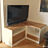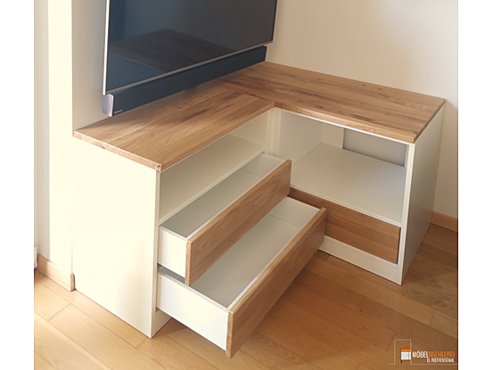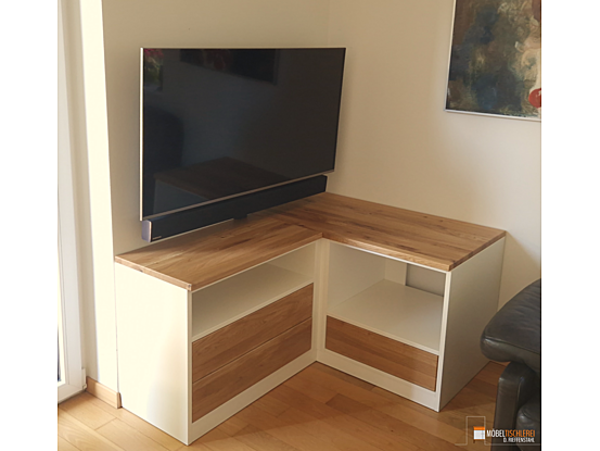 Dieses TV-Lowboard in L-Form kombiniert eine weiß lackierte Oberfläche mit Fronten und Deckplatte aus massiver, klar lackierter Eiche. Die natürliche Holzoptik und das schlichte Design schaffen eine moderne und zugleich wohnliche Atmosphäre – perfekt für den Wohnbereich.
