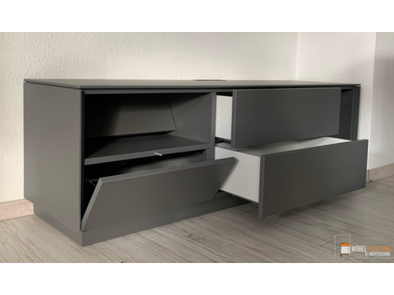 Dieses schiefergraue TV-Lowboard überzeugt durch klare Linien und moderne Zurückhaltung. Ausgestattet mit praktischen Schubkästen und einer Klapptür bietet es ausreichend Stauraum für Technik und Zubehör – ideal für ein aufgeräumtes Wohnzimmer mit stilvollem Charakter.