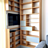 Dieses maßgefertigte TV-Eckregal überzeugt durch seine asymmetrische Gestaltung in Grau und Eiche-Dekor. LED-Bänder in der Deckplatte sorgen für stimmungsvolle Beleuchtung. Besonderes Highlight: Der integrierte Fernseher lässt sich bei Bedarf seitlich herausziehen – funktional und elegant zugleich.