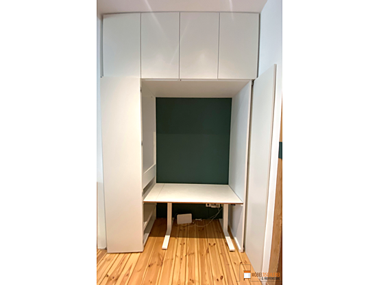 Dieser Homeoffice-Arbeitsplatz mit höhenverstellbarem Schreibtisch lässt sich durch das Schließen der Türen schnell verstauen und sorgt so für einen gedankenfreien Feierabend. Der Nischenschrank bietet reichlich Stauraum für Büromaterialien und sorgt für Ordnung im Arbeitsbereich. Perfekt für ein flexibles und ordentliches Arbeitsumfeld.