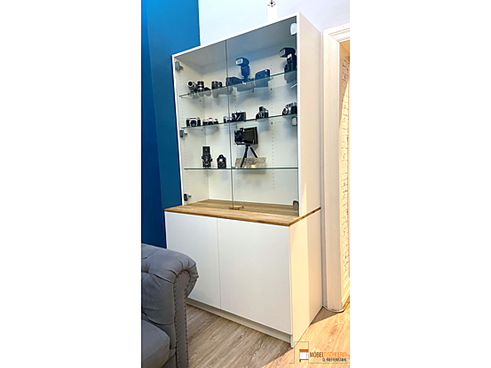Diese Kameravitrine bietet im oberen Element eine ideale Präsentationsfläche, während der untere Bereich großzügigen Stauraum für größeres Zubehör bietet. Ideal für Fotografen, die ihre Ausrüstung ordentlich und professionell zur Schau stellen möchten.