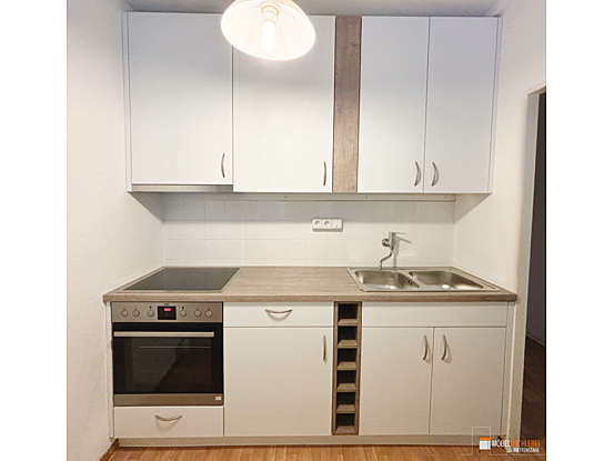 Diese schlichte Küchenzeile in Weiß, kombiniert mit grauem Eiche-Dekor, bietet eine zeitlose Möbellösung. Das funktionale Design und die hochwertige Verarbeitung machen diese Küche zu einem stilvollen Highlight.