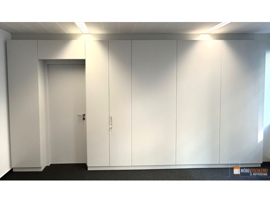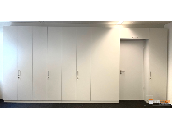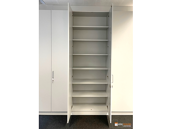 Dieser weiße Büroraumteiler mit abschließbaren Schränken schafft Struktur und sicheren Stauraum für Akten und Büroutensilien – ideal für eine geordnete Arbeitsumgebung.