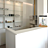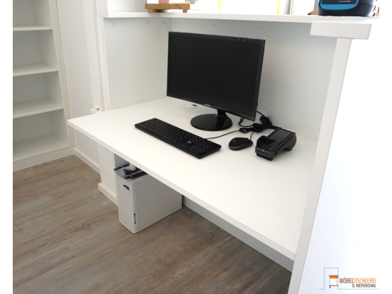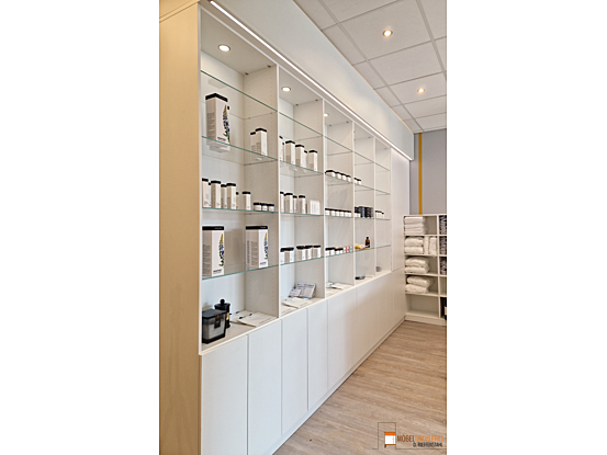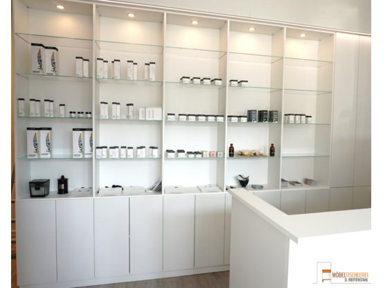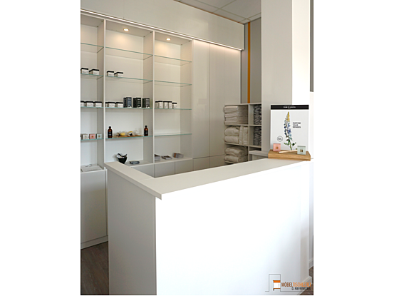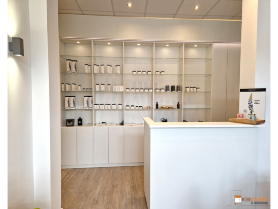 Der Empfangsbereich eines Spas sorgt dafür, dass Gäste sofort den stressigen Alltag hinter sich lassen können. Ein einladender Empfangstresen heißt Besucher herzlich willkommen, während ein großes Wandregal mit integrierten LED-Spots die verwendeten Produkte stilvoll in Szene setzt. Ein weiteres Regal bietet praktischen Stauraum und dient als Handtuchlager. Eintreten und wohlfühlen – der perfekte Start für Ihr Spa-Erlebnis.
