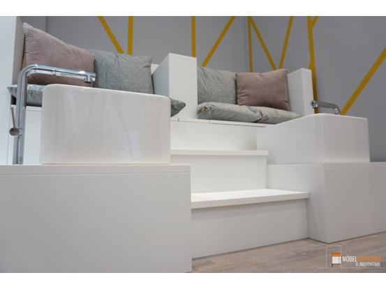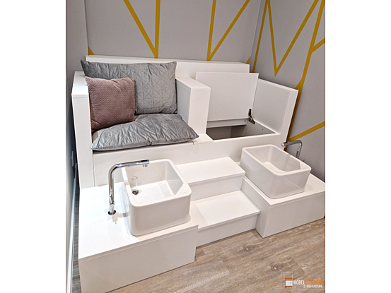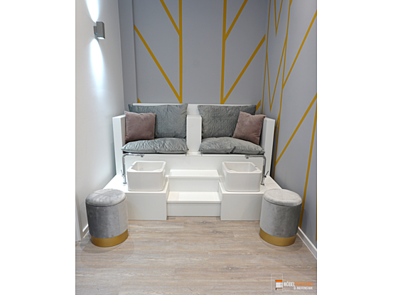 Einfach zurücklehnen und sich von erfahrenen Pediküre-Expert*innen verwöhnen lassen – dafür haben wir eine maßgefertigte Pedikürebank für ein Spa konzipiert. Der Pediküre-Thron ist groß genug für zwei Personen und ermöglicht eine entspannende Fußpflege zu zweit. Mit der eingebauten Treppe lässt sich der Thron bequem besteigen und sorgt für eine komfortable und funktionale Möbellösung. So wird jedes Pediküre-Erlebnis zu einem stilvollen Wohlfühlprogramm.