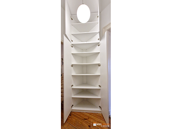 Dieser maßgefertigte Flureckschrank nutzt die spitzwinklige Nische optimal aus und schafft durch die Nutzung der Deckenhöhe zusätzlichen Stauraum. Mit variablen Einlegeböden lässt sich der Stauraum flexibel an die eigenen Bedürfnisse anpassen – für eine ordentliche und funktionale Lösung im Flur.