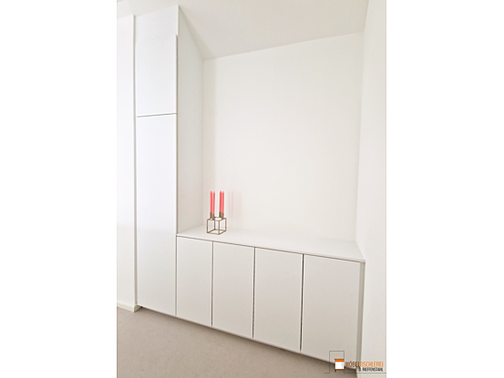 Dieser weiße Flurschrank besticht durch sein zeitloses Design und fügt sich harmonisch in jede Flurnische ein. Der hohe Schrank verbirgt geschickt einen Sicherungskasten und bietet im unteren Bereich mit seinen individuell anpassbaren Einlegeböden praktischen Stauraum. Eine großzügige Ablagefläche schafft Platz für Bilder und Dekoration, während das klare Design dem Raum eine leichte und elegante Atmosphäre verleiht.