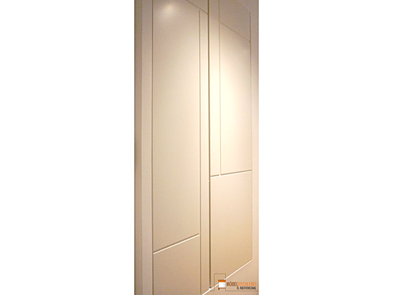 Dieser Schrank fügt sich nahtlos in eine Flurnische ein und besticht durch seine asymmetrischen Fräsungen auf den weiß lackierten Türen. Beim Öffnen zeigt sich ein wahres Multifunktionstalent: Neben Platz für eine Waschmaschine und Zubehör bieten die Schubkästen zugleich eine praktische Treppe, um an Deckeninstallationen zu gelangen. Zusätzliche Schrankeinbauten sorgen für noch mehr Stauraum.