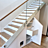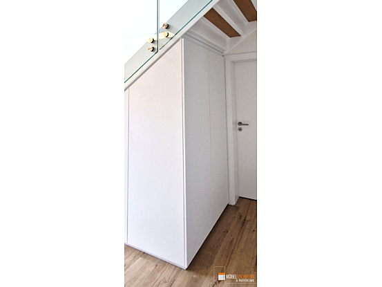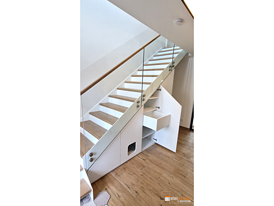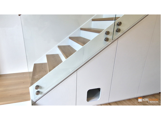 Dieser Treppenschrank in Weiß fügt sich perfekt in den Raum unter der Treppe ein. Mit einem seitlichen Garderobenschrank und einem integrierten, herausziehbaren Bereich für das Schmusekätzchen bietet er nicht nur Stauraum, sondern auch eine praktische Lösung für die Pflege des Haustiers.