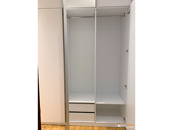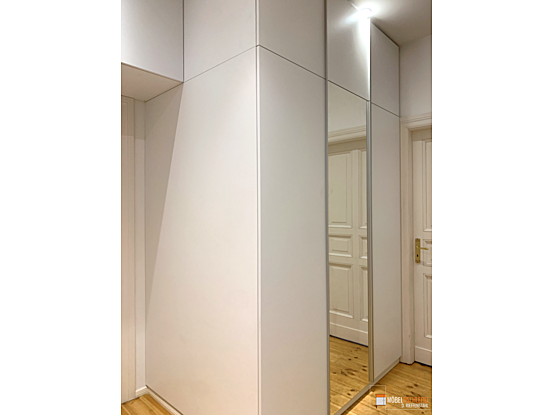 Dieser deckenhohe Flurschrank bietet mit drei Kleiderstangen, Einlegeböden und Schubkästen viel Stauraum für Jacken, Accessoires und mehr. Die eleganten Griffleisten ermöglichen einfaches Öffnen und Schließen, während die Spiegeltür das Prüfen des Outfits vor dem Verlassen des Hauses ermöglicht.