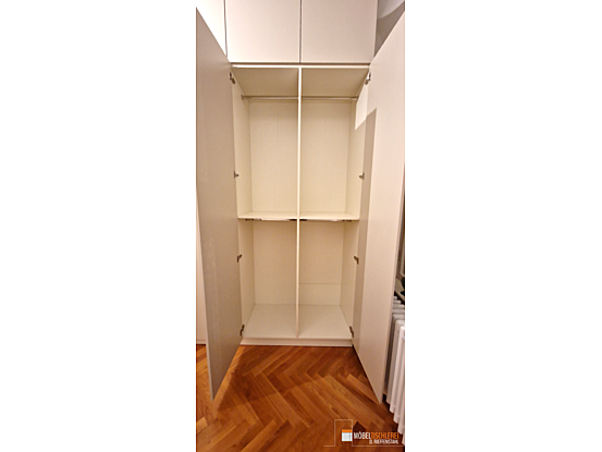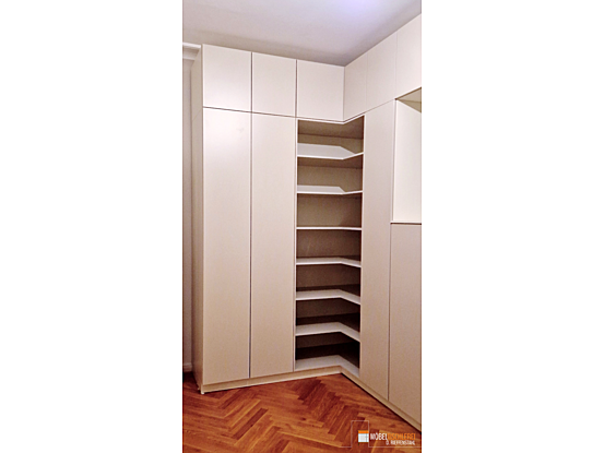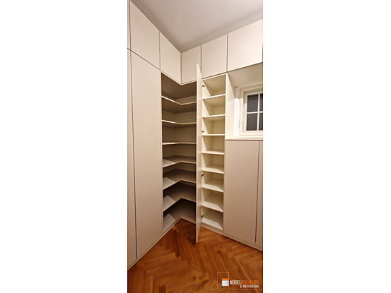 Dieses Ankleidezimmer nutzt den Raum perfekt, ohne überladen zu wirken. Die Beigetöne schaffen ein warmes, modernes Ambiente, das klassisch und einladend ist. Das geschickt integrierte Fenster sorgt für Tageslicht und Funktionalität. Die offene Regal-Ecke lockert die Optik auf und stellt ein stilvolles Designelement dar.