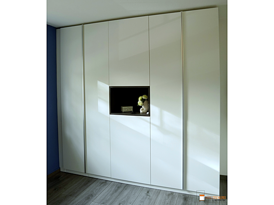 Der Kleiderschrank besticht durch ein mittig eingebautes, offenes Regal in Ulme Onyx, das Dekorationen perfekt in Szene setzt. Die türhohen Alugriffleisten runden das Design ab. Im Inneren bieten Schubkästen und flexibel anpassbare Einlegeböden vielseitigen Stauraum.