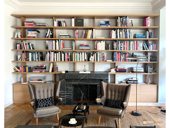 Dieses passgenaue Bücherregal in Eiche-Dekor wurde exakt an die Wandbreite angepasst und integriert sich harmonisch in den Wohnraum. Die weißen Rückwände sorgen für einen ruhigen Kontrast, während die Aussparung für den Kamin das Regal zu einem echten Unikat macht. Viel Platz für Bücher und stilvolle Atmosphäre inklusive.