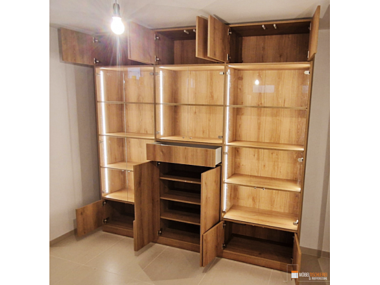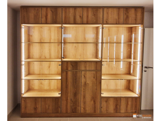 Dieses Regal im Eiche-Dekor kombiniert eine beleuchtete Vitrine, um die Lieblingsstücke stilvoll in Szene zu setzen, mit praktischen, geschlossenen Elementen für zusätzlichen Stauraum.