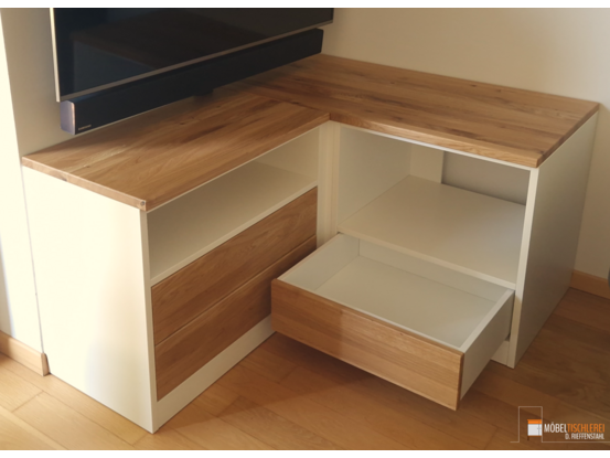 Dieses TV-Lowboard in L-Form kombiniert eine weiß lackierte Oberfläche mit Fronten und Deckplatte aus massiver, klar lackierter Eiche. Die natürliche Holzoptik und das schlichte Design schaffen eine moderne und zugleich wohnliche Atmosphäre – perfekt für den Wohnbereich.